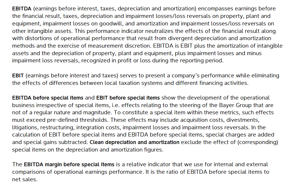 Für ein konkretes Beispiel lohnt sich der Blick in den Geschäftsbericht eines Unternehmens. Hier wird beispielhaft das EBITDA von Bayer für das Geschäftsjahr 2025 herangezogen. Bayer weist im Geschäftsbericht 2025 ein EBITDA von 1.708 Mio. EUR sowie ein EBITDA before special items von 9.669 Mio. EUR aus.
