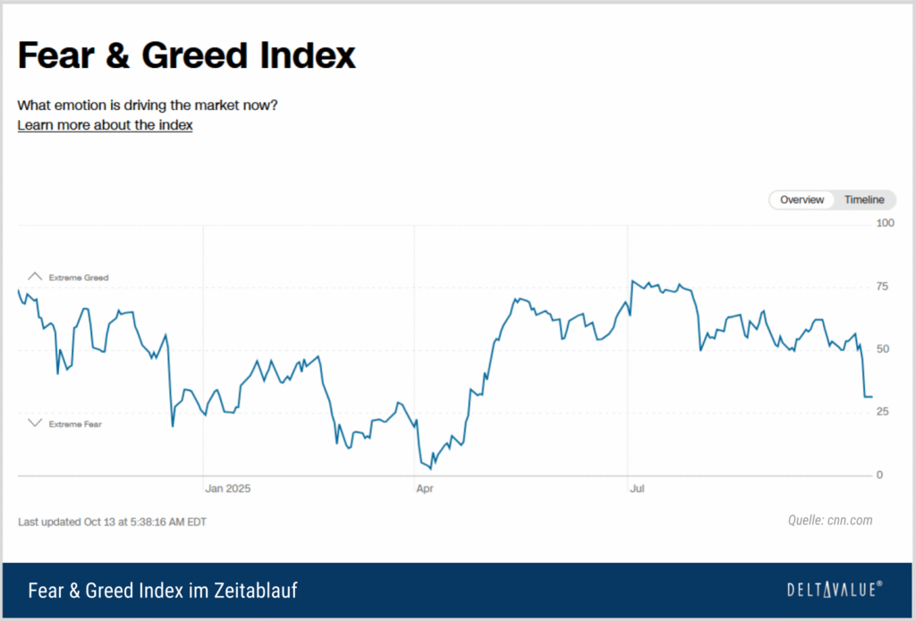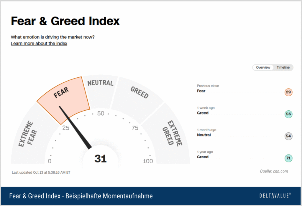 - Fear: Ein niedriger Indexwert deutet auf verbreitete Risikoaversion hin. Anleger meiden risikobehaftete Anlagen und verhalten sich defensiv.