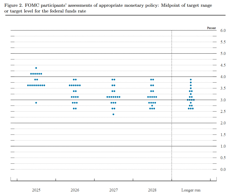 Der Dot-Plot visualisiert die Zinsprognosen der FOMC-Mitglieder und wird vierteljährlich im Rahmen der Summary of Economic Projections (SEP) veröffentlicht. Jeder Punkt repräsentiert die individuelle Einschätzung eines Mitglieds zum erwarteten Federal Funds Rate am Jahresende des laufenden sowie der beiden folgenden Jahre und langfristig.