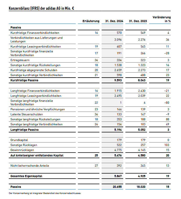 In der Konzernbilanz nach IFRS der adidas AG zum 31. Dezember 2024 werden die Passivpositionen des Unternehmens dargestellt. Unter anderem ist hier das Fremdkapital ausgewiesen, das sich in kurzfristige und langfristige Posten unterteilt.