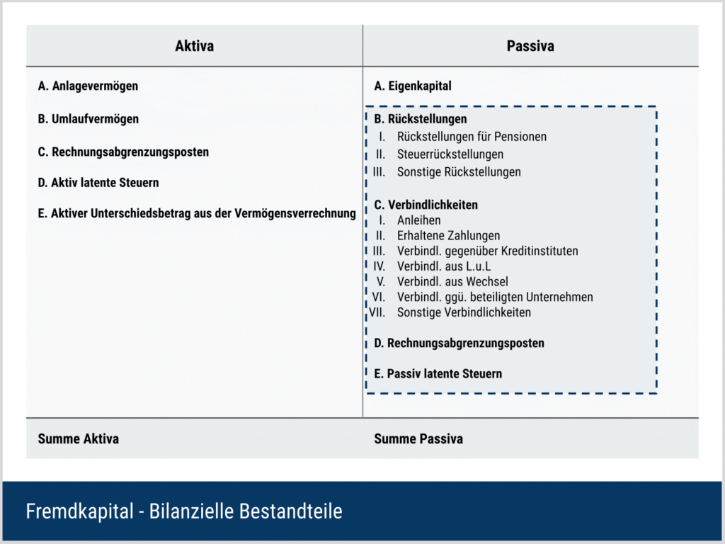In der Bilanzgliederung nach HGB umfasst Fremdkapital die Blöcke B–E auf der Passivseite der Bilanz: Rückstellungen, Verbindlichkeiten, passive Rechnungsabgrenzungsposten (RAP) und passive latente Steuern (vgl. §§ 266, 250, 274 HGB).