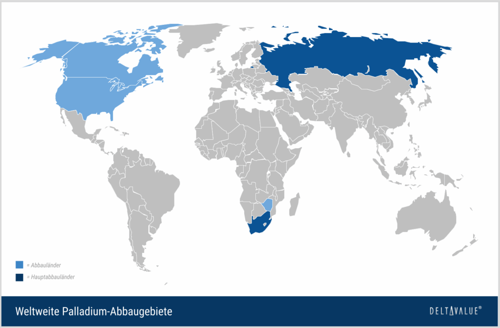 Palladium hat ein relativ geringes Produktionsvolumen (nur 190 Tonnen im Jahr 2024). Im Vergleich dazu liegt die Goldproduktion bei ca. 3.300 Tonnen. Bei Silber sind es sogar ca. 25.000 Tonnen. Als wichtigste Palladium-Produzenten sind hierbei Südafrika und Russland zu nennen.